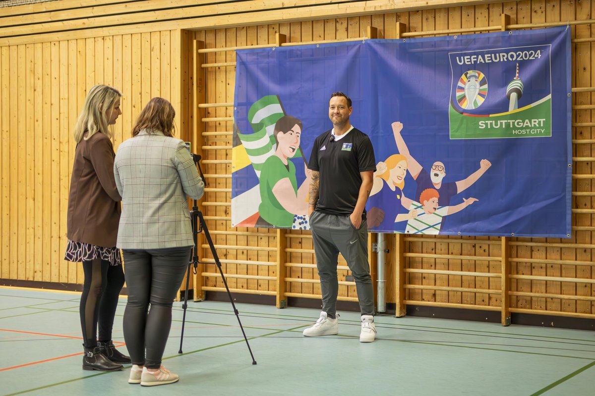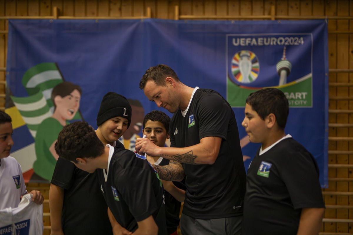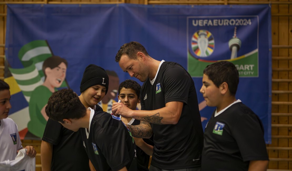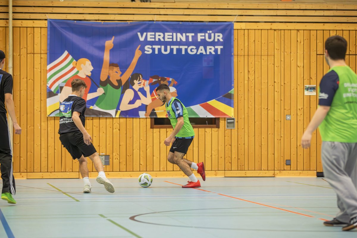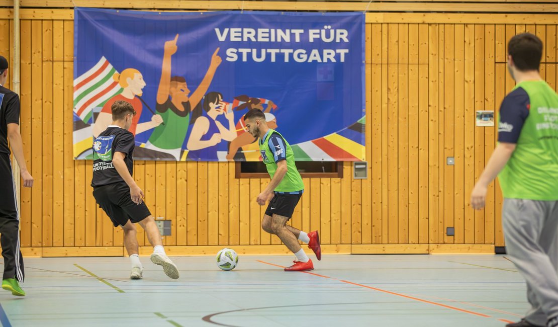 Fairness und Fußball sind zwei Begriffe, die eng miteinander verbunden sind und die beim „Fairen Fußballturnier“ der Host City Stuttgart am Freitag, 13. Oktober 2023, im Mittelpunkt standen. Knapp zwei Monate vor dem Final Draw und der Gruppenauslosung zur UEFA EURO 2024 rollte der Ball in der Sporthalle Nord: Rund 50 Jugendliche und junge Erwachsene im Alter von 14 bis Mitte 20 kickten beim Fairen Fußballturnier, organisiert in Kooperation mit dem Gemeinschaftserlebnis Sport (GES) und ihrem Projekt „Nachtschwärmer“ sowie dem Jugendhaus Nord. Ebenfalls dabei: Julian Schieber, ehemaliger Bundesliga-Profi, der u.a. für den VfB Stuttgart, Borussia Dortmund oder Hertha BSC Berlin gespielt hat, zum Turnier.